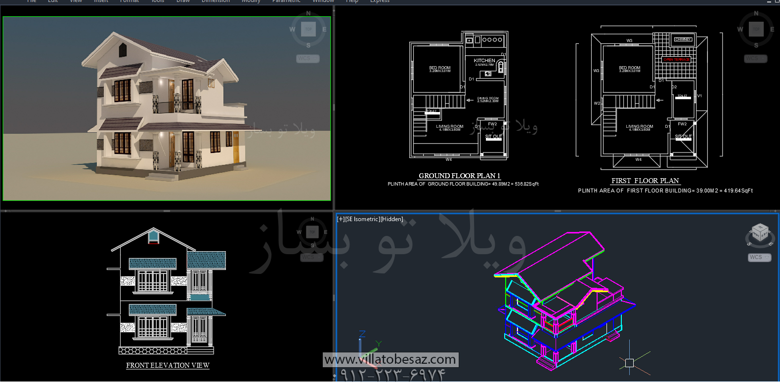 علاوه بر ارتفاعات جلویی، فایل DWG شامل یک نقشه سه بعدی کامل از خانه، و یک فایل 3D Max با TEXTURES پیوست شده است.