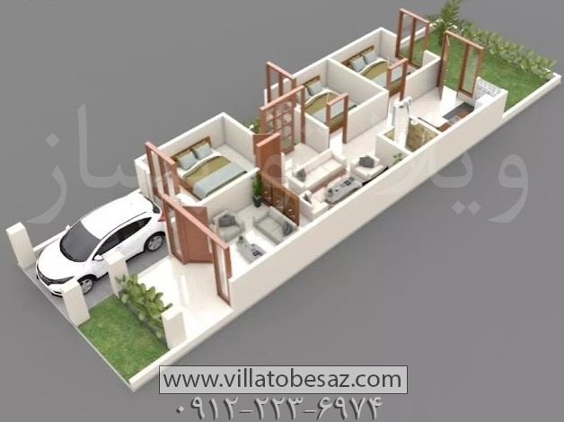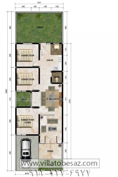 این طراحی خانه از جلو کوچک به نظر می رسد زیرا عرض آن ۶ متر است. با این حال، طراحی کشیده به پشت باعث می شود این خانه همچنان دارای امکانات راحت باشد. برای جزئیات اندازه هر اتاق در این خانه می توانید در تصویر بالا مشاهده کنید.