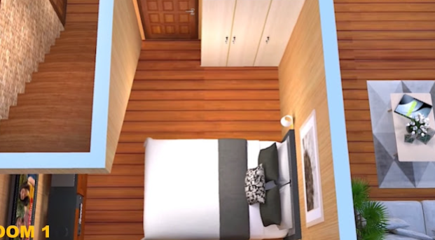 در اینجا ما یک اتاق خواب در طبقه اول را انتخاب می کنیم. اتاق خواب دارای سقفی شیبدار از راه پله است. اما، می‌توانید با استفاده از قسمت شیب‌دار برای مکان مطالعه یا استفاده از آن برای آویزان کردن تلویزیون به دیوار، به زیبایی طراحی کنید.